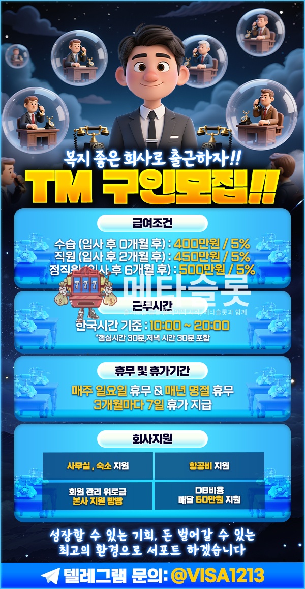 ((해외)) TM 구인모집!! 작성자 정보 이시국 작성 작성일 2026.01.12 22:18 컨텐츠 정보 52 조회 목록 답글 쓰기 본문 TM 구인모집!! >> 구인모집 급여 조건 500만원 + 5% 근무 시간 10시간 (점심, 저녁시간 제외 시 9시간) 휴무 및 휴가기간 매주 일요일 휴무 3개월마다 7일 휴가 숙소 지원, 항공비 지원 영업 지원 관련자료 이전 ⭐️ 카지노 미니게임 안전⭕️ ⭐️7년차 최상부 받치기 작성일 2026.01.12 22:27 다음 ❤️돈되는 정보 모아왔어요❤️ 작성일 2026.01.12 22:15 댓글 0 등록된 댓글이 없습니다. Select File Upload File 목록 답글 쓰기